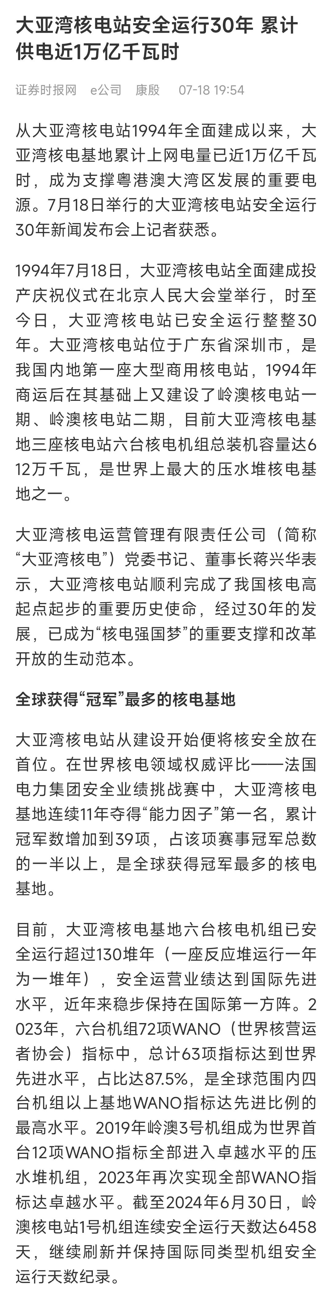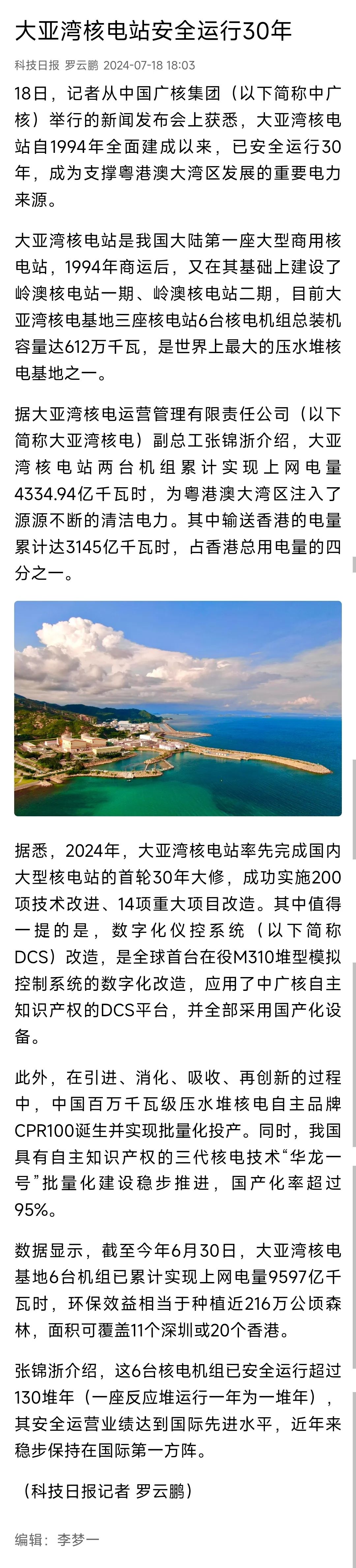 今年,中廣核廣東大亞灣核電站迎來投產(chǎn)三十周年。從大亞灣核電站1994年全面建成以來,大亞灣核電基地累計(jì)上網(wǎng)電量已近1萬億千瓦時(shí),為粵港澳大灣區(qū)的發(fā)展提供了堅(jiān)實(shí)的能源保障。30年的穩(wěn)健發(fā)展使得大亞灣核電站不僅成為了支撐我國(guó)核電強(qiáng)國(guó)夢(mèng)想的關(guān)鍵力量,也成為了改革開放政策下成功發(fā)展的典范。