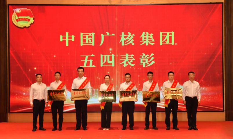 ▲核電股份公司財(cái)務(wù)總監(jiān)尹恩剛為獲得集團(tuán)五四紅旗團(tuán)委的先進(jìn)青年集體代表頒獎(jiǎng)