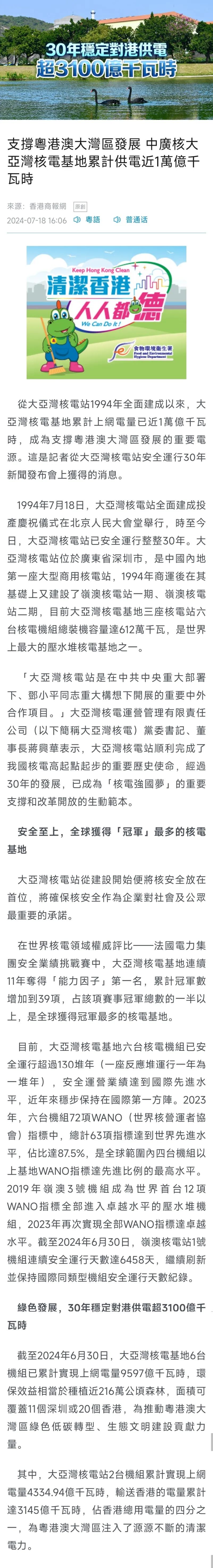 今年,中廣核廣東大亞灣核電站迎來投產(chǎn)三十周年。從大亞灣核電站1994年全面建成以來,大亞灣核電基地累計(jì)上網(wǎng)電量已近1萬億千瓦時(shí),為粵港澳大灣區(qū)的發(fā)展提供了堅(jiān)實(shí)的能源保障。30年的穩(wěn)健發(fā)展使得大亞灣核電站不僅成為了支撐我國(guó)核電強(qiáng)國(guó)夢(mèng)想的關(guān)鍵力量,也成為了改革開放政策下成功發(fā)展的典范。